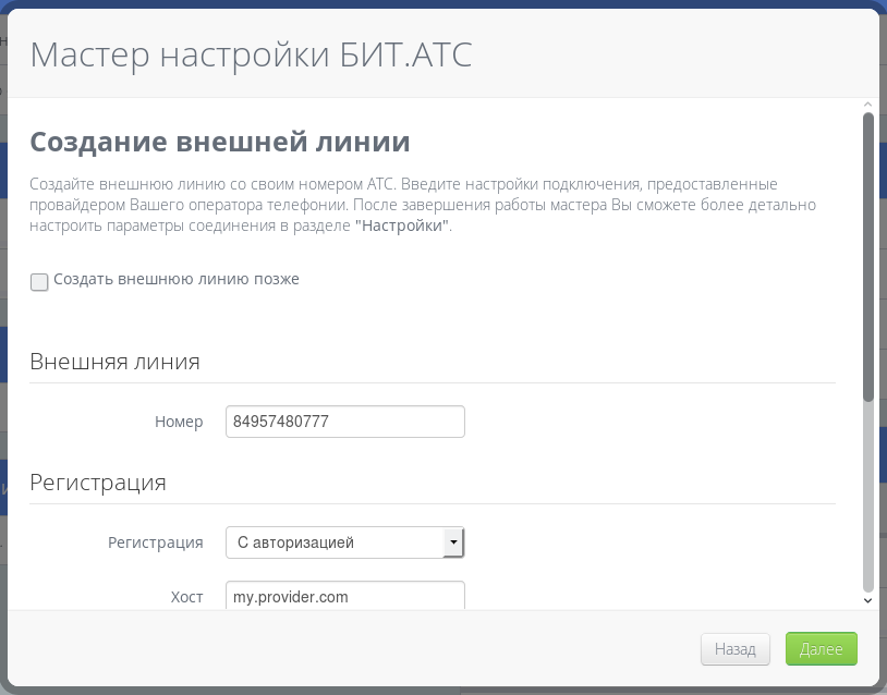 Если у Вас уже есть выделенная внешняя линия, укажите номер и настройки подключения к провайдеру, предоставляющему услуги IP-телефонии.