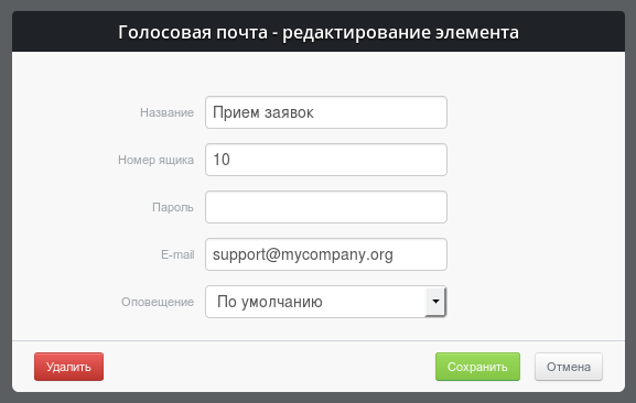Модуль «Голосовая почта» позволяет создавать и размещать на схеме общие ящики для хранения голосовых сообщений. Информация о поступлении нового голосового сообщения будет отправлена на почтовый ящик, указанный в настройках модуля.