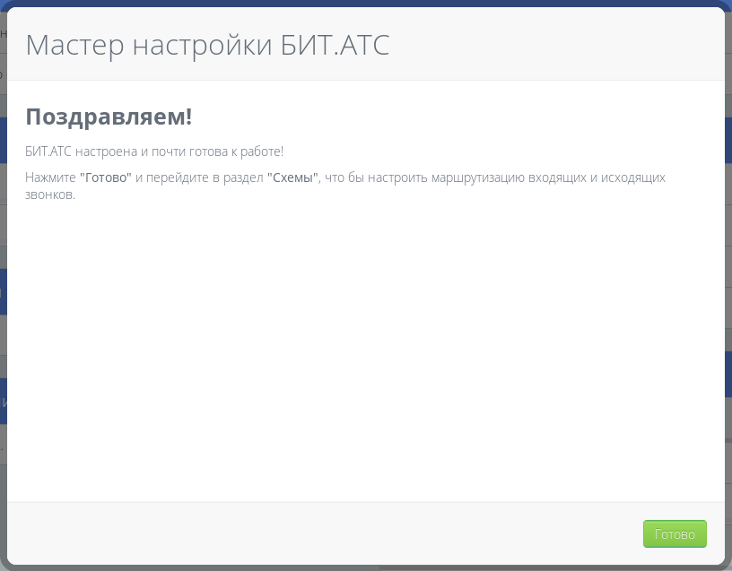 По завершении работы мастера Вы увидите сообщение об успешной настройке. Нажмите «Готово» для перехода в основной интерфейс управления БИТ.АТС.