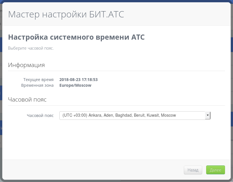 Выберите из списка свой часовой пояс для корректного отображения и обработки времени и нажмите «Далее».