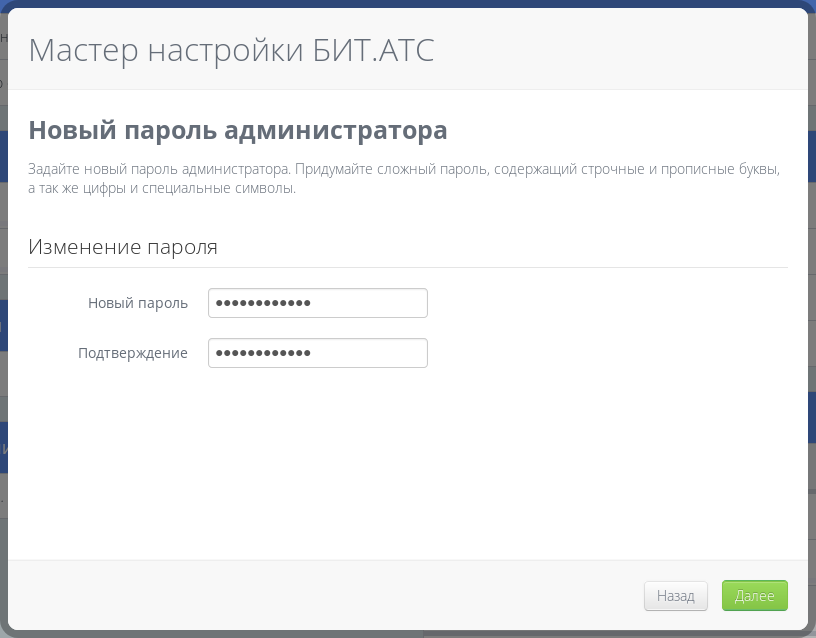 При первом входе в панель управления БИТ.АТС мастер поможет в несколько простых шагов произвести начальную настройку АТС.