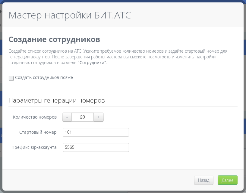 На данном этапе можно автоматически сгенерировать список сотрудников с заданным диапазоном внутренних номеров. После генерации каждому сотруднику будет создан SIP-аккаунт.