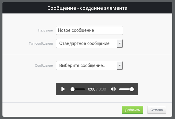 Модуль «Сообщение» позволяет добавить на схему информационное голосовое сообщение. В зависимости от ситуации можно разместить полезную информацию для абонента, сообщение в нерабочее время организации или уведомление о неправильно набранном номере. Элементы модуля сообщения так же могут быть использованы другими модулями.