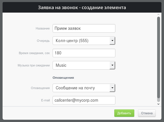 Музыка при ожидании - Музыка, которая будет проигрываться абоненту во время ожидания ответа. Если музыка не указана, абонент будет слышать длинные гудки.