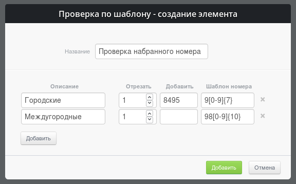 Модуль «Проверка по шаблону» позволяет задать отдельную ветку обработки для группы номеров, подходящих по маске. Например, в зависимости от кода города, можно направлять звонок на группу, ответственную за регион, либо настроить на исходящей схеме выход через разные транки для городских, междугородных и мобильных номеров.