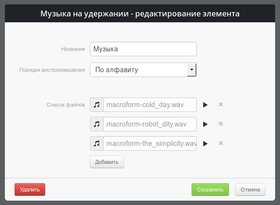 Модуль «Музыка на удержании» позволяет создать отдельные плейлисты с набором мелодий, которые будут проигрываться абоненту во время ожидания при переводе, а так же задать музыку при ожидании в некоторых модулях БИТ.АТС.