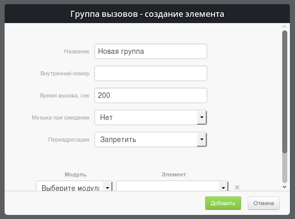 Модуль «Вызов группы» позволяет направлять вызов одновременно на несколько внутренних номеров сотрудников, а так же внешних номеров. Вызов осуществляется одновременно на все указанные номера до тех пор, пока кто-нибудь из участников группы не возьмет трубку.