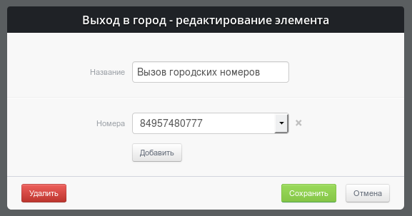 В параметре «Номера» нужно выбрать линию, через которую будет осуществлен вызов. Кнопка «Добавить» позволяет указать несколько резервных линий.