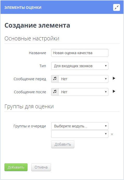 Группы и очереди - указываются группы и очереди, операторы которых будут оцениваться клиентами.