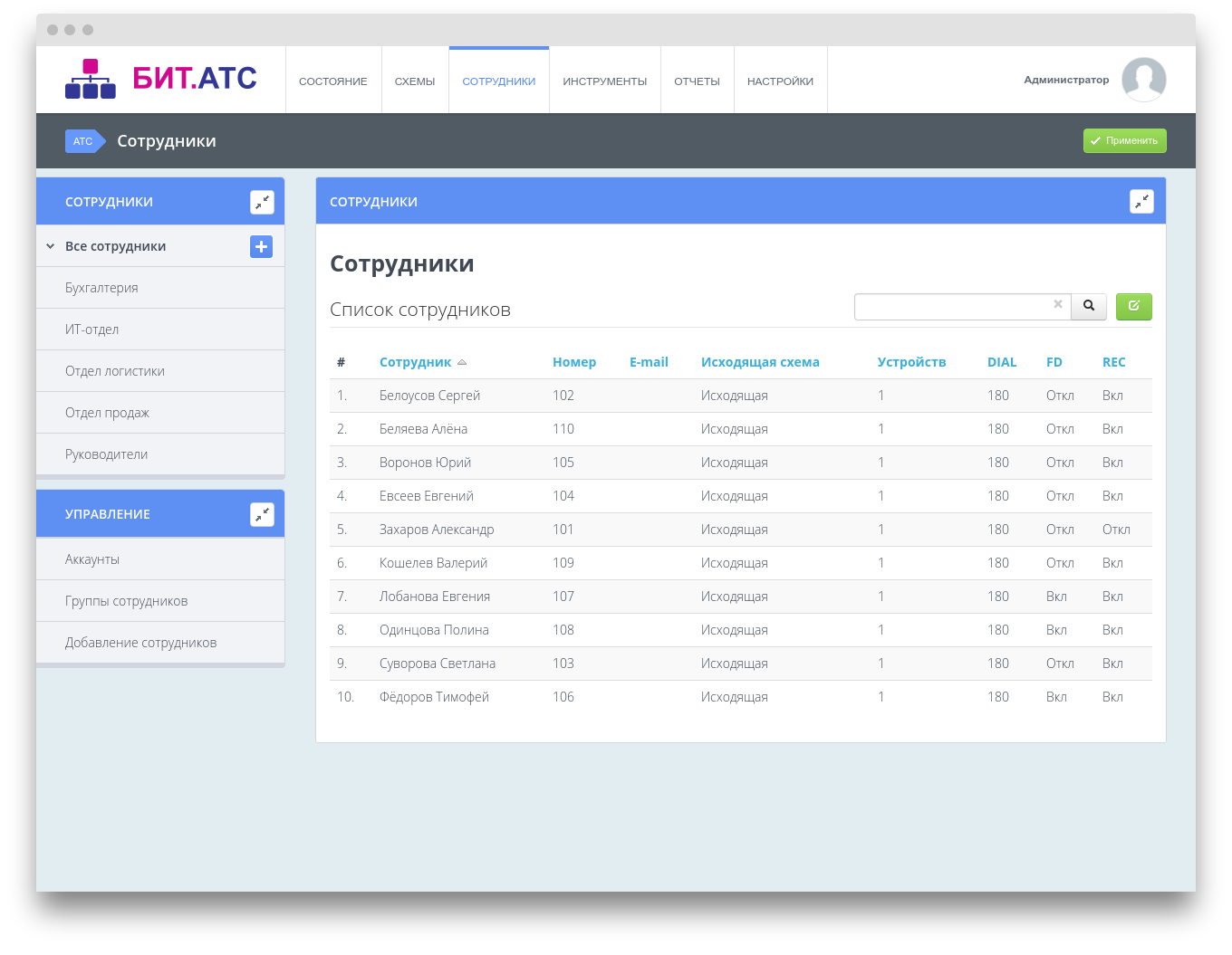 Список сотрудников, имеющихся на БИТ.АТС, представлен в виде таблицы со значением основных параметров каждого из сотрудника.
